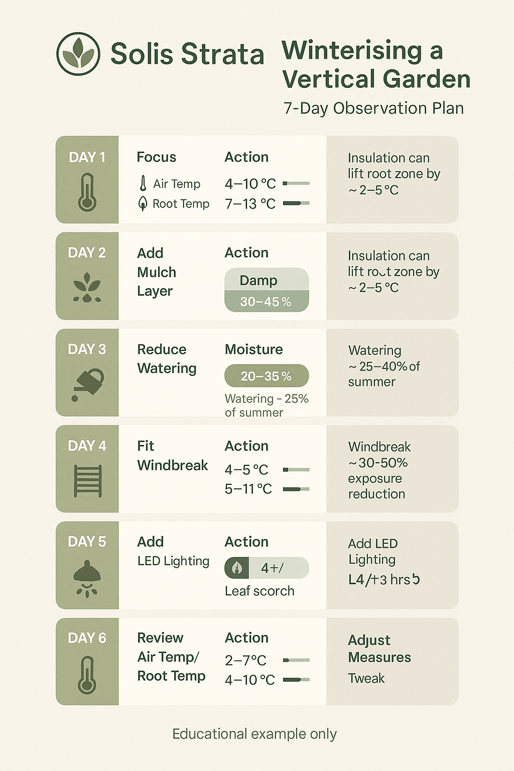 Here’s a calm, seven-day observation plan I use with pupils and balcony gardeners alike. It’s not prescriptive; think of it as a rhythm to notice how your vertical garden responds to winter. Use ranges, keep notes, and adjust gently rather than making big swings.