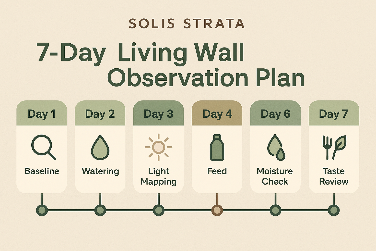 - Day 1 — Baseline look-over: Photograph the wall. Note droop, leaf colour (deep green to pale), and any dry/flooded pockets.